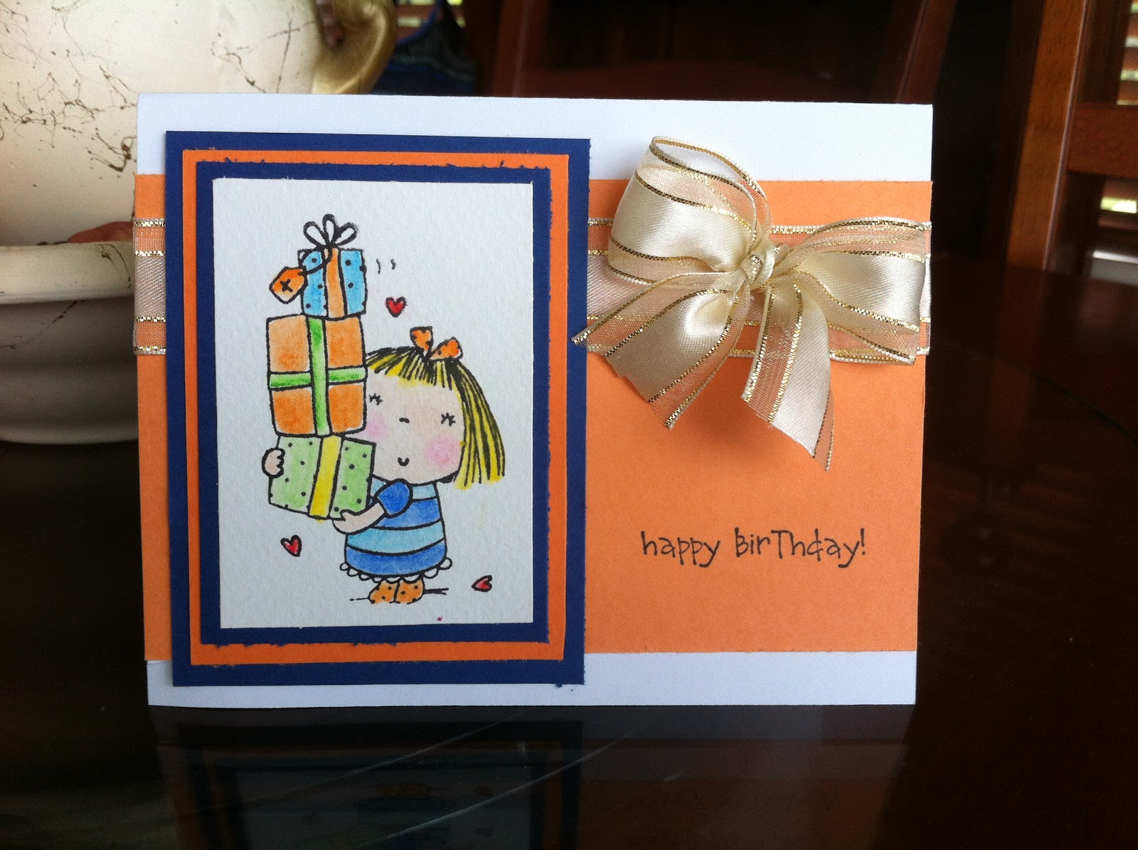 I thought I might put up a card that I made for my neice. I really enjoy trying the watercolour effects. I'm still learning all the techniques that go with watercolouring, but I don't mind the end results too much lol.