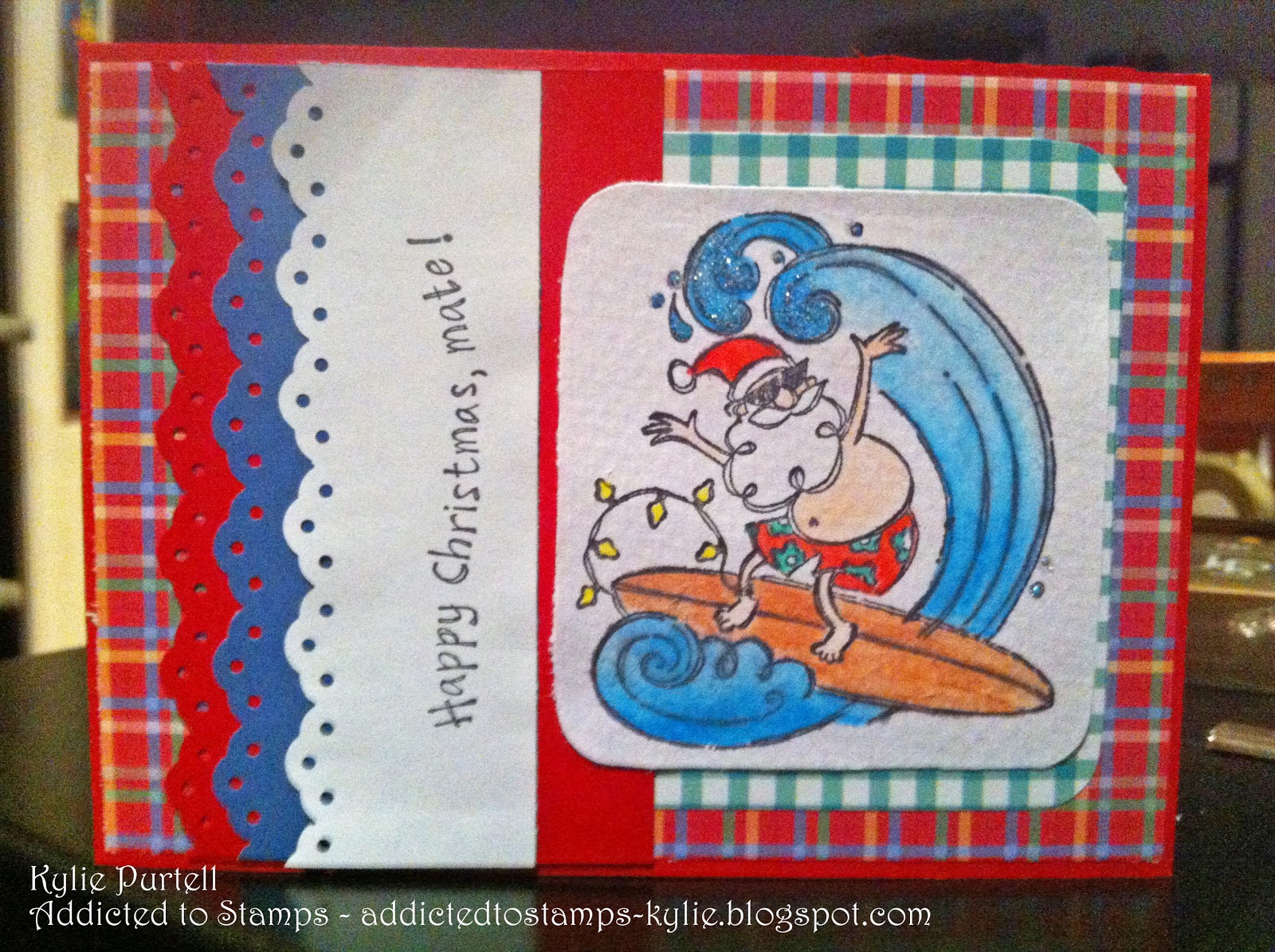 Using the sketch provided for the challenge, I decided to do a very Australian theme. You can't get more Aussie than Santa going for a surf at Christmas time!