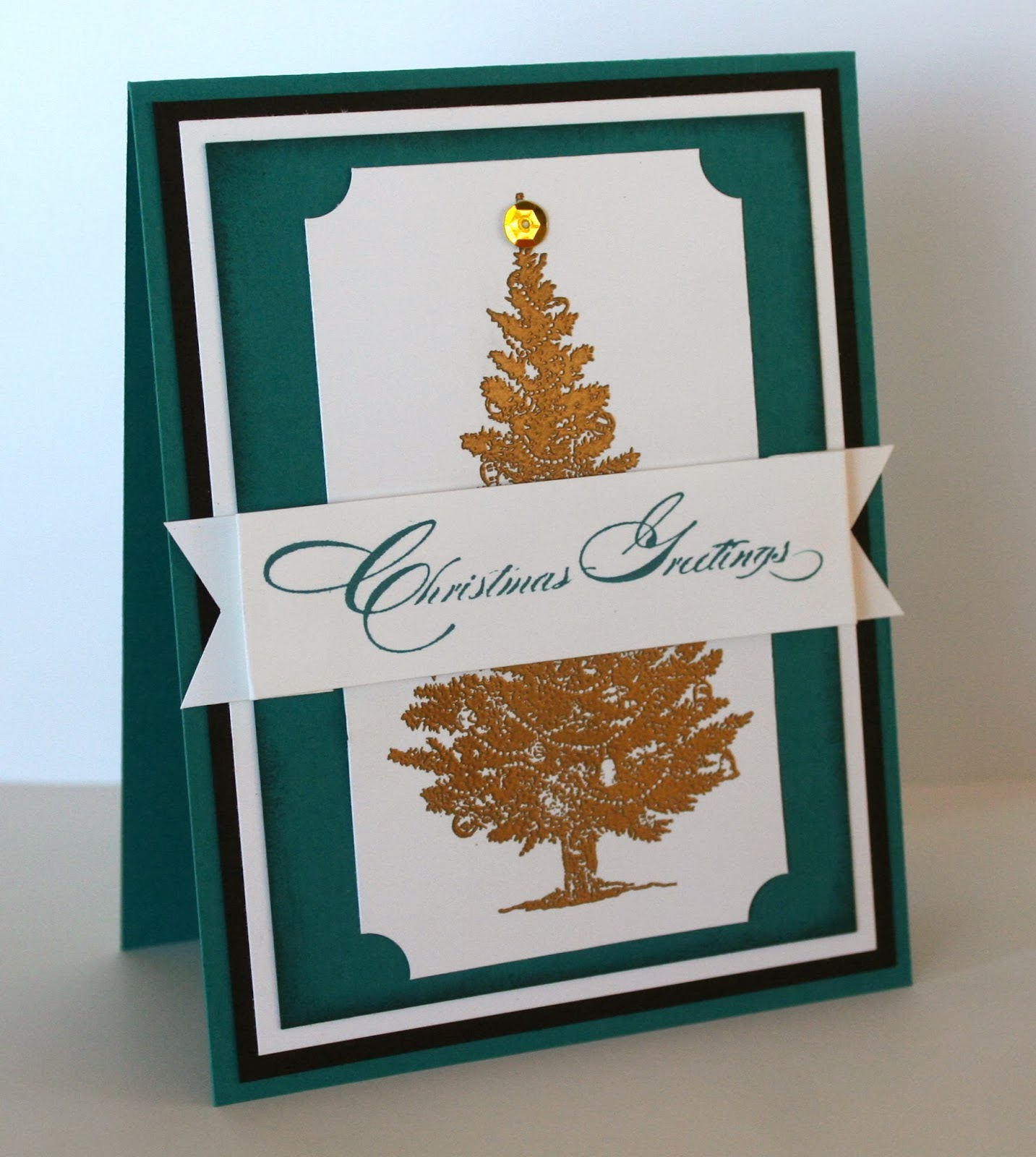 This card looks nicer in real life. The colours on the card aren't quite true on my monitor. This, too, is a new stamp set called Special Season. The Christmas Tree has been embossed with gold powder. I thought the one little sequin at the top of the tree was enough for this card. The cardstock is Island Indigo, as is the ink for the sentiment.