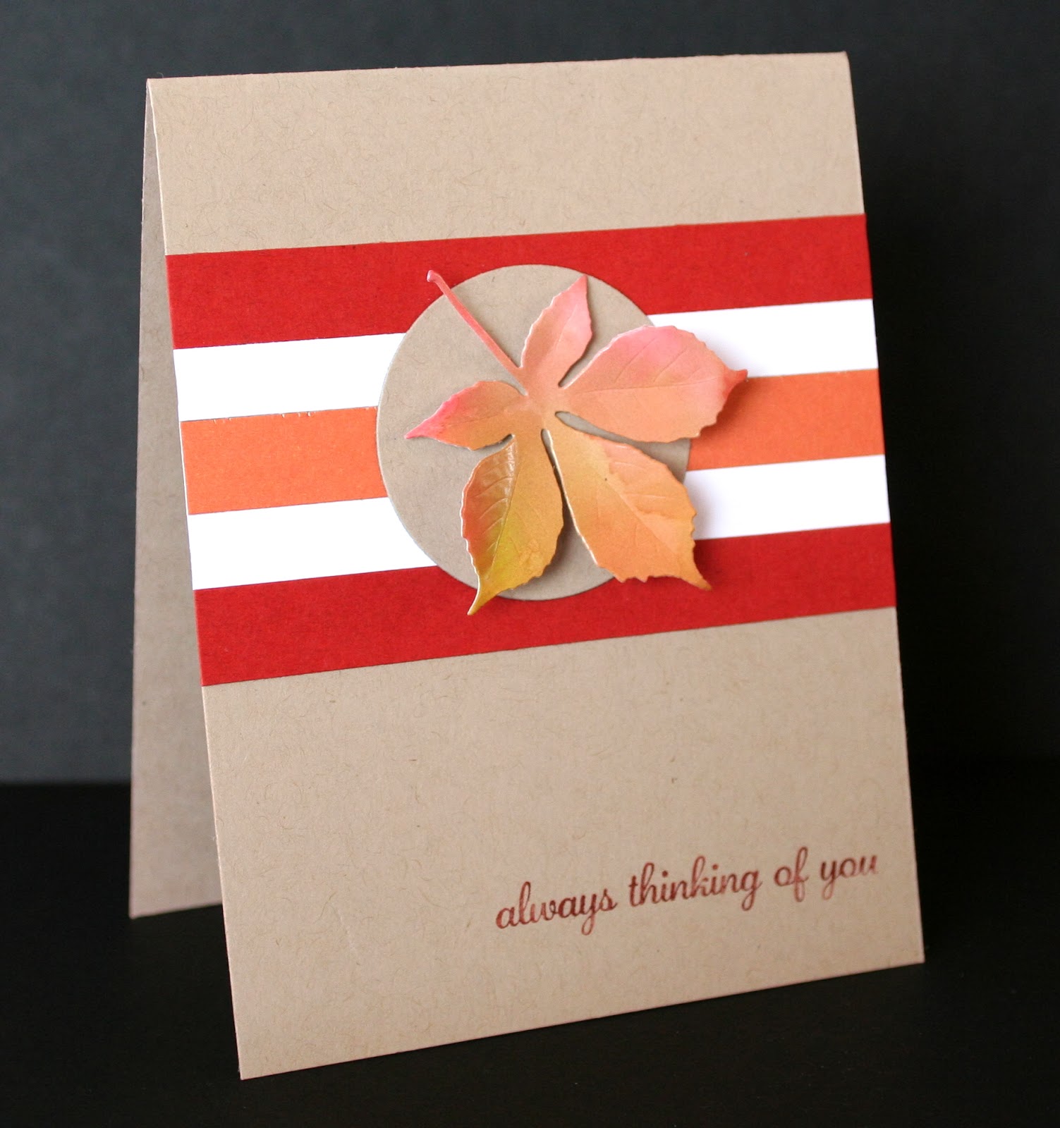 I started with a Crumbcake base and then cut strips of different 'earthy' colours and glued them directly to the base. I used my Framelits Circle Collection to die cut a circle to mount my leaf onto.