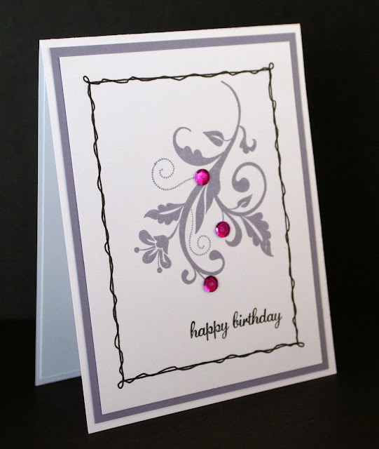 I have used a new stamp set on this card called Flowering Flourishes. I thought that the Wisteria Wonder and Black colours were perfect. I have hand drawn the border.