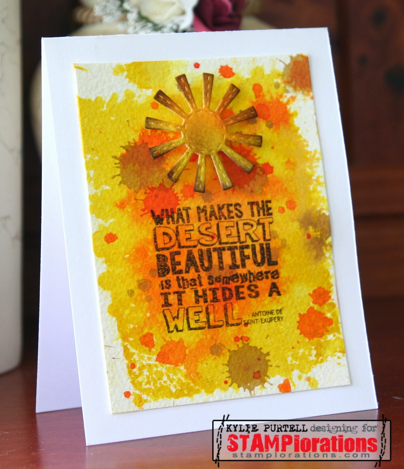 I wanted to use this stamp from the TYPOGRAFIA: Encouragement set so I inked up my acrylic blocks with Distress Ink colours (Spiced Marmalade, Mustard Seed & Scattered Straw) I felt reflected the desert. I die cut a sun from another panel that I used the same technique for and inked the edges with a brown ink.