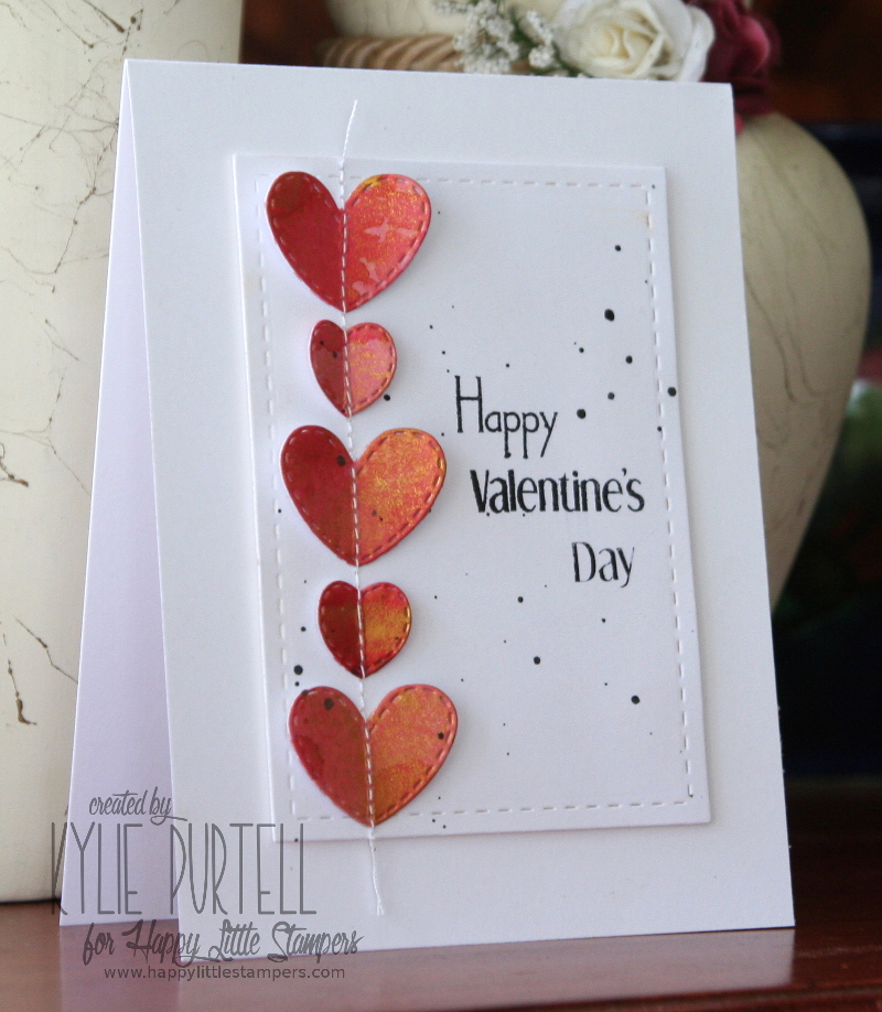 I die cut the hearts once the paper was dry and used a small amount of double sided tape to adhere them to my card. I zipped it through the sewing machine then folded the edges of the hearts a little.