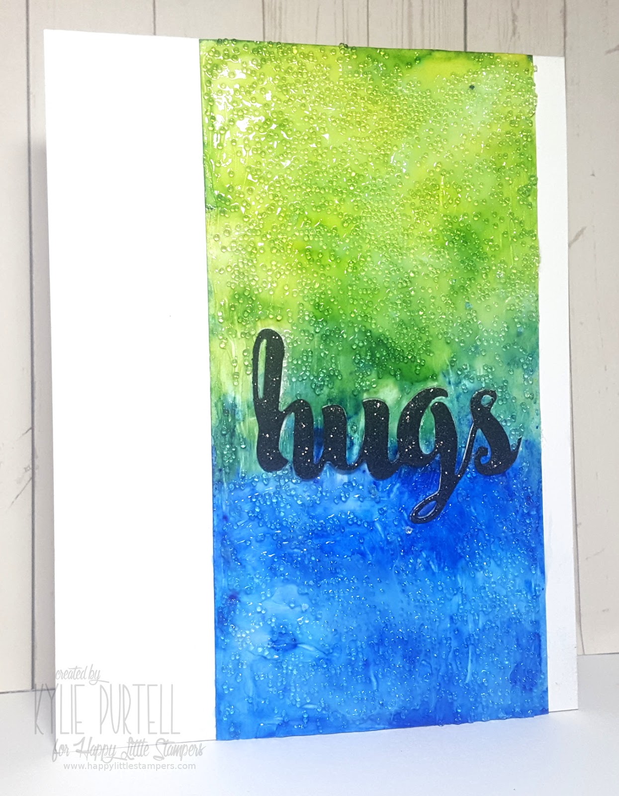 This was created by smooshing Brusho (Prussian Blue and Lime Green) onto glossy cardstock. With a little leftover ink, I did the same on a spare bit of paper and stamped and die cut my butterfly. I used my MISTI to stamp my sentiment as you have to be very careful with glossy cardstock that you don't slip everywhere! (The butterfly and sentiment are from the HLS Butterfly Birthday and I used the coordinating dies).