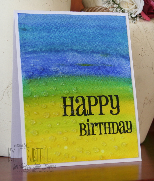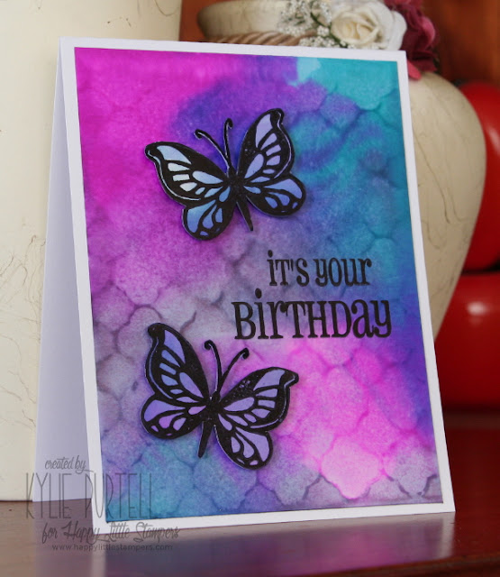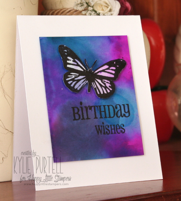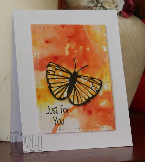 This card was created using Brushos straight onto glossy cardstock. I hadn't tried this before and I loved how easy it was. I sprinkled my brushos onto the paper then used a HLS mini mister to activate the crystals. I stamped the butterfly onto a snippet of left over card and fussy cut it out. The butterfly and sentiment are from the HLS Butterfly Birthday set.