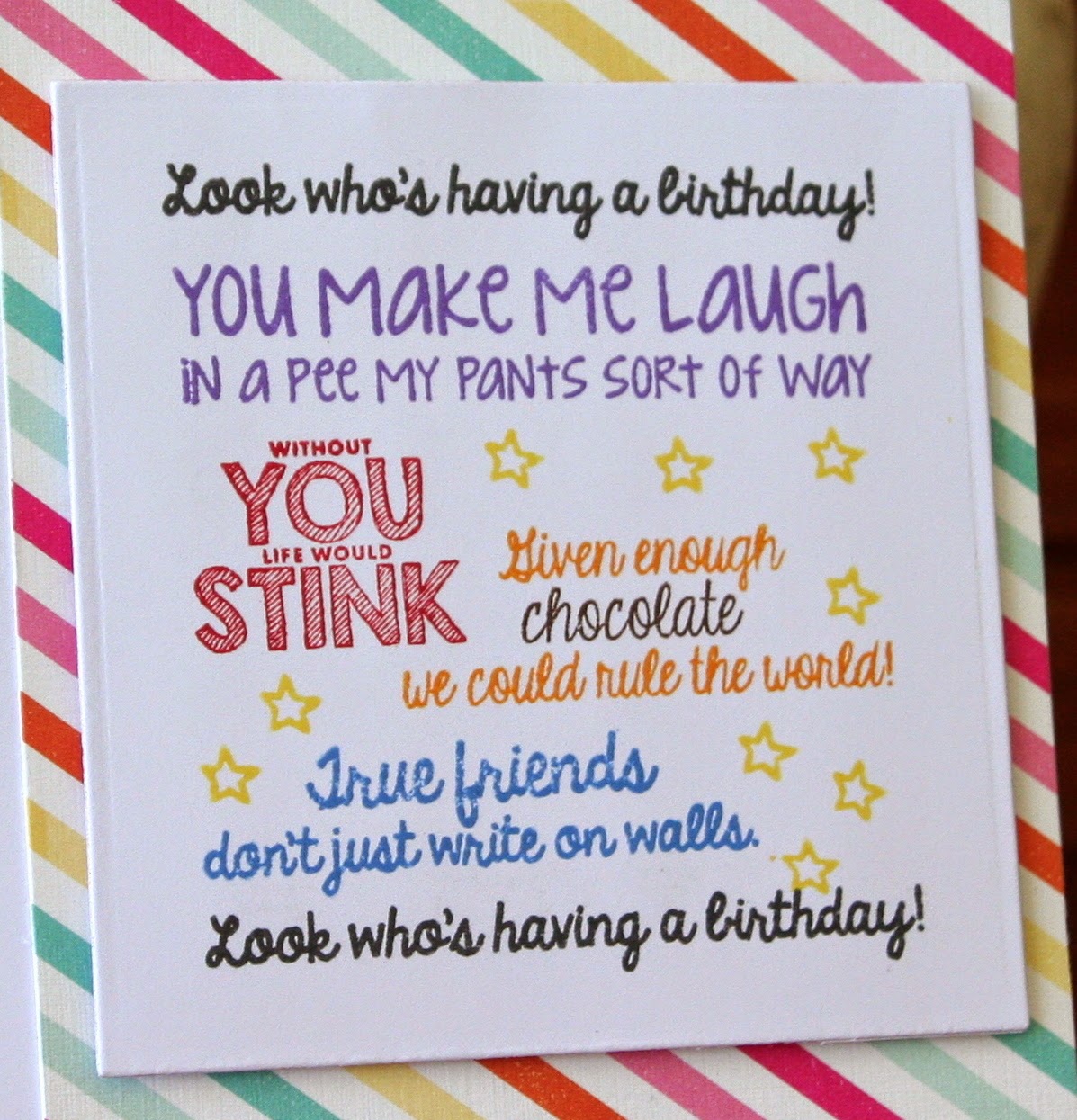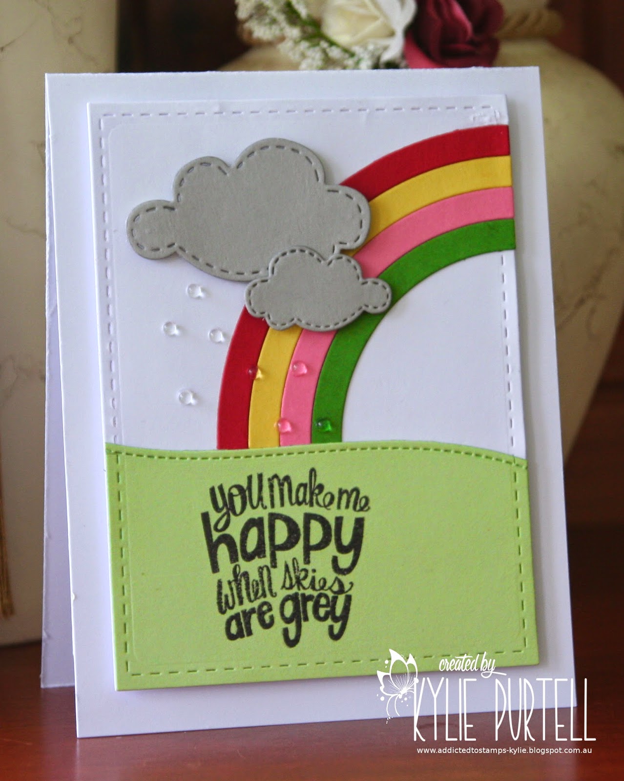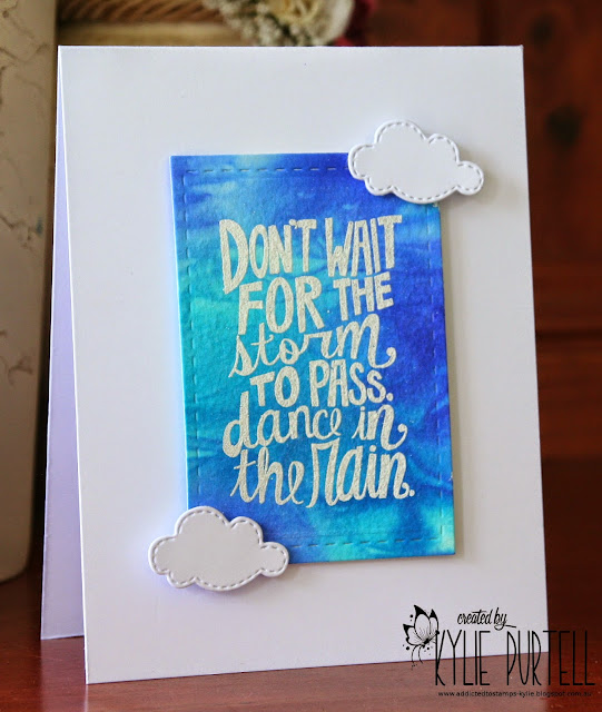 A very simple card. Embossed sentiment and little clouds popped up with foam pads.