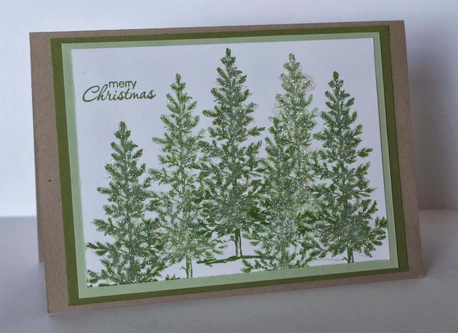 I have used my Lovely as a Tree set which really should be used more often. Focusing on stamping, I inked up the pine tree with Gumball Green and used my stamp-a-ma-jig for placement. Without re-inking, I then stamped again. I repeated this process a couple of times.