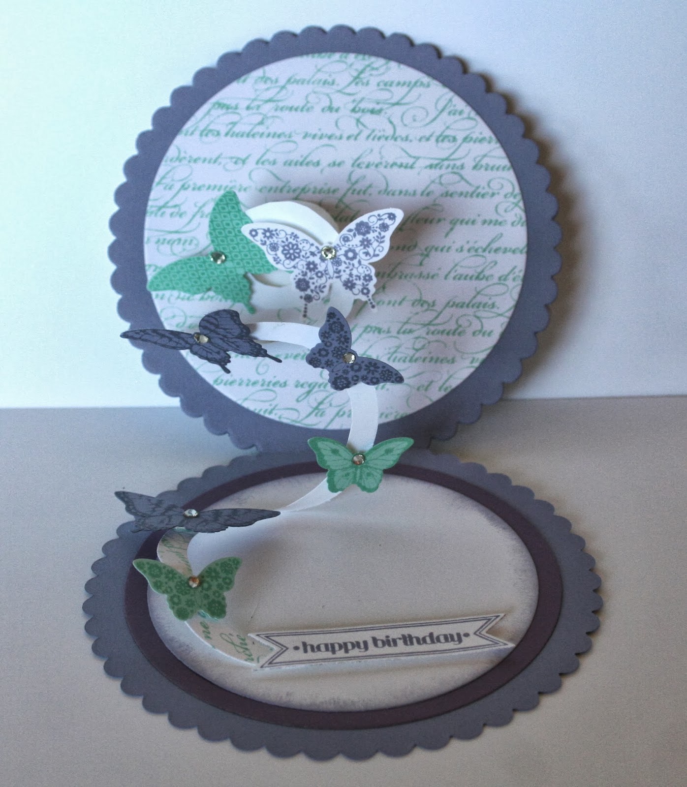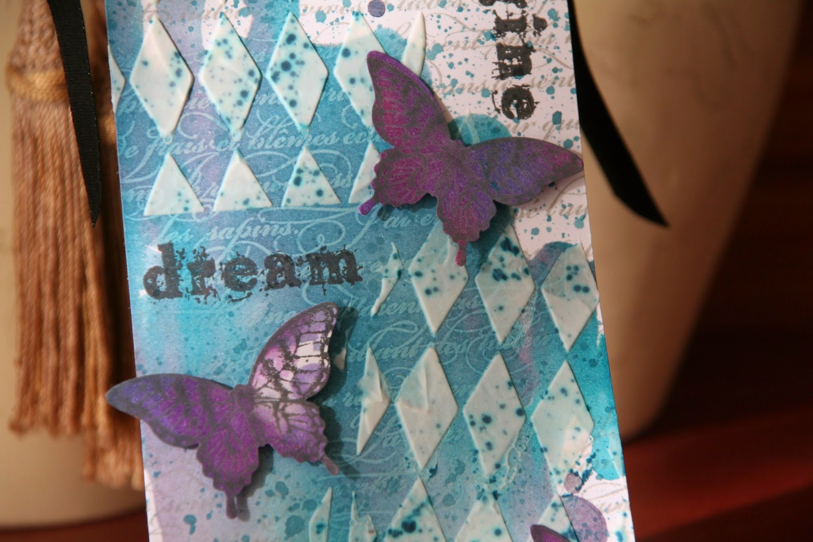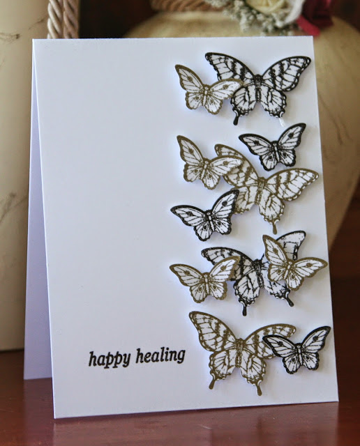 I embossed a heap of butterflies that have a coordinating punch from SU. I popped them all up on foam pads. The sentiment is from Inspired by Stamping.
