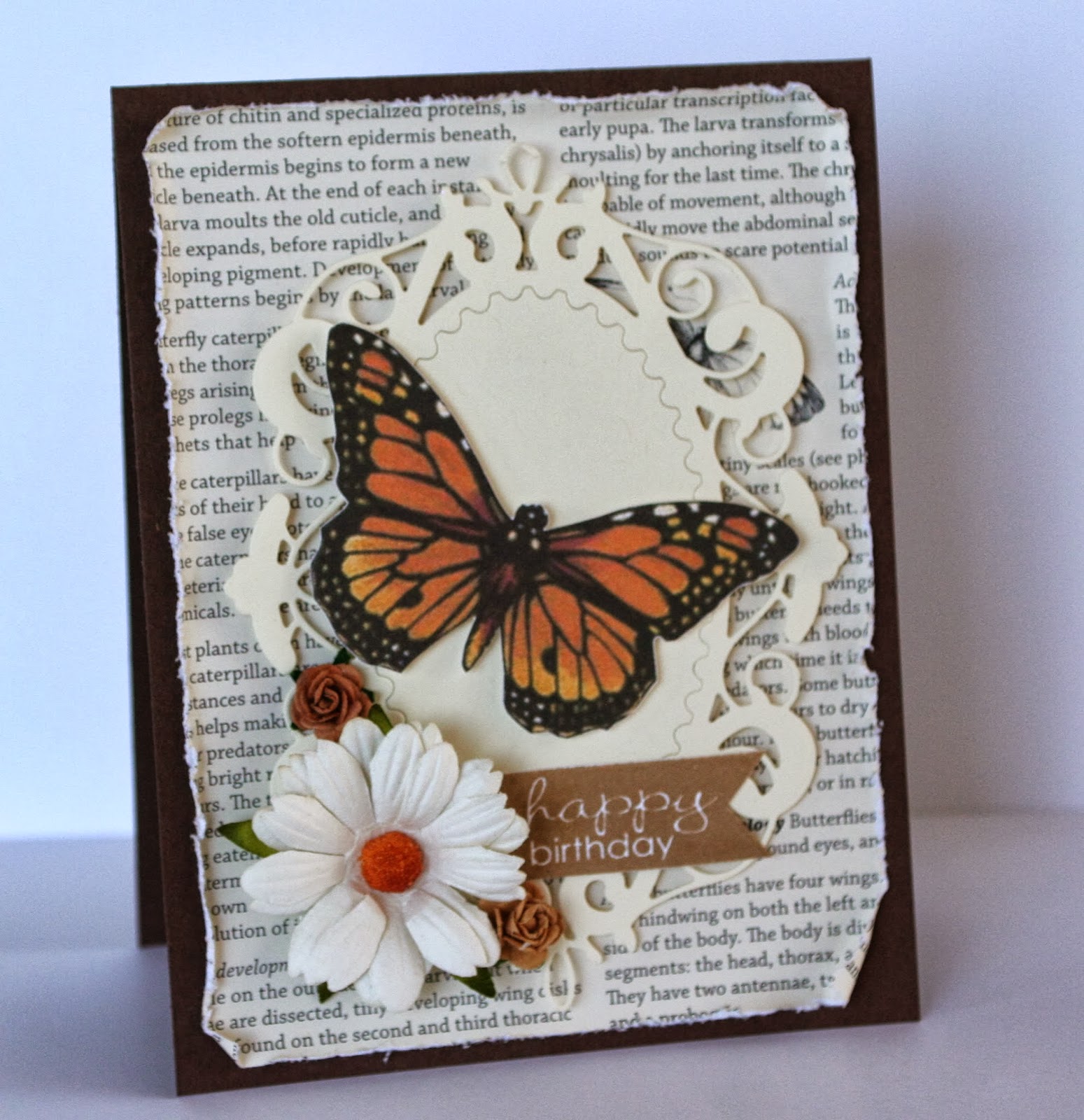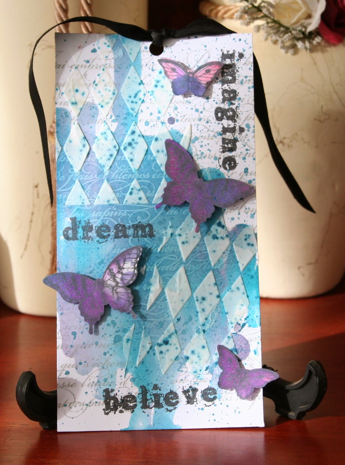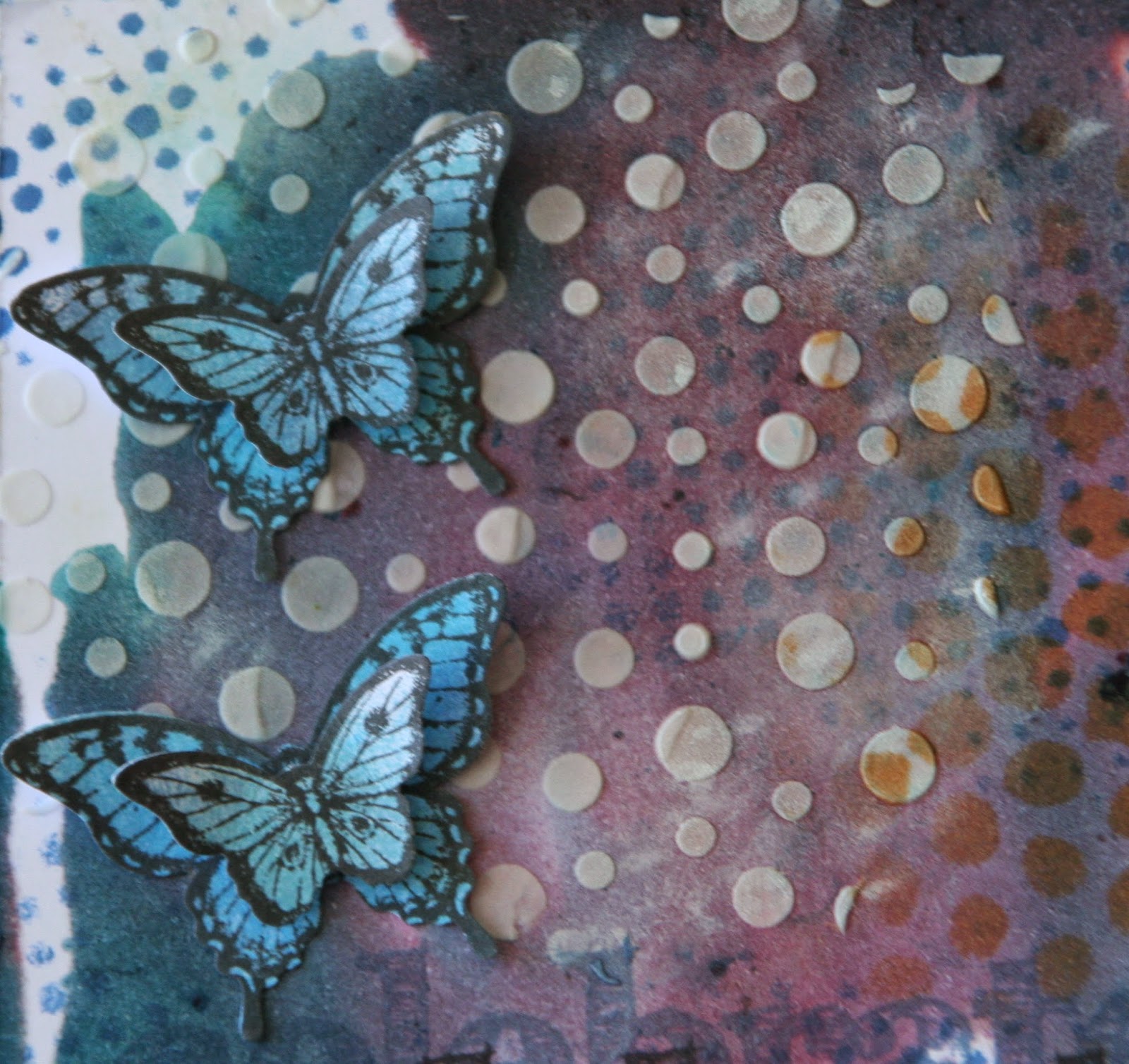 I embossed a heap of butterflies that have a coordinating punch from SU. I popped them all up on foam pads. The sentiment is from Inspired by Stamping.