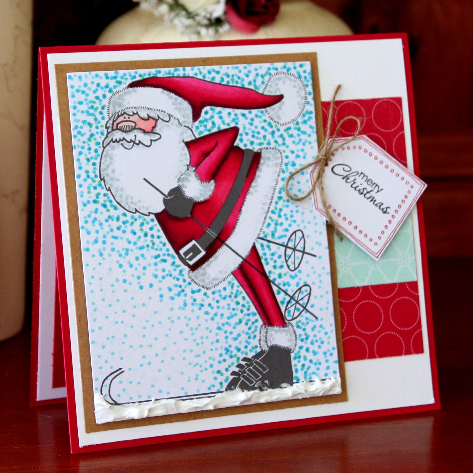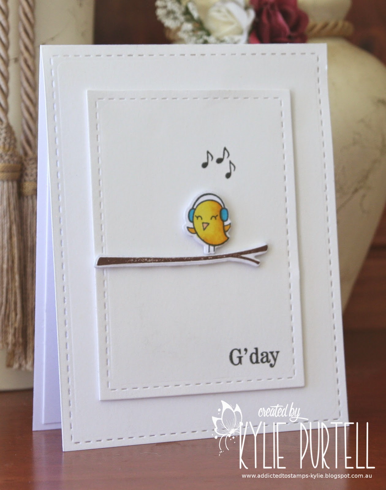 This is a one layer card. I decided that linking up the elephants from the HLS Whimsical Friends set would be fun to do. I coloured them using Spectrum Noir markers (IG7, IG5, IG3, IG2) and then used some really inexpensive gel pens (from Aldi) to colour the blankets and toenails. They have a wonderful sparkle to them.